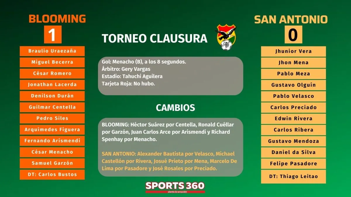 Con un gol a los ocho segundos del partido por parte de César Menacho, Blooming se impuso por la mínima diferencia sobre el campeón San Antonio Bulo Bulo (1-0), este viernes en el estadio Tahuichi Aguilera por el inicio de la segunda jornada del torneo Clausura.