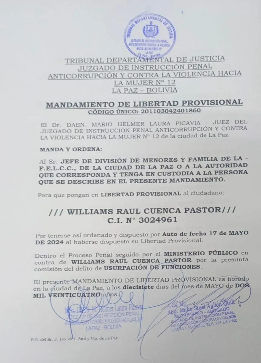 Luego fue conducido a la Fuerza Especial de Lucha Contra el Crimen (FELCC), donde estuvo arrestado, y de oficio se le instauró una investigación por la presunta comisión del delito de usurpación de funciones al vestir una prenda similar a la policial.