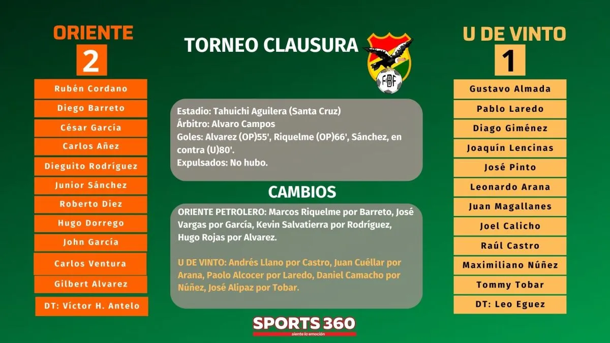 A diez minutos del final, descontó la U de Vinto tras un remate de Cuéllar que se desvió en Sánchez y el balón se metió en la portería de Oriente. Intentó el empate la U de Vinto pero Oriente se defendió bastante bien y no hubo ningún gol más.