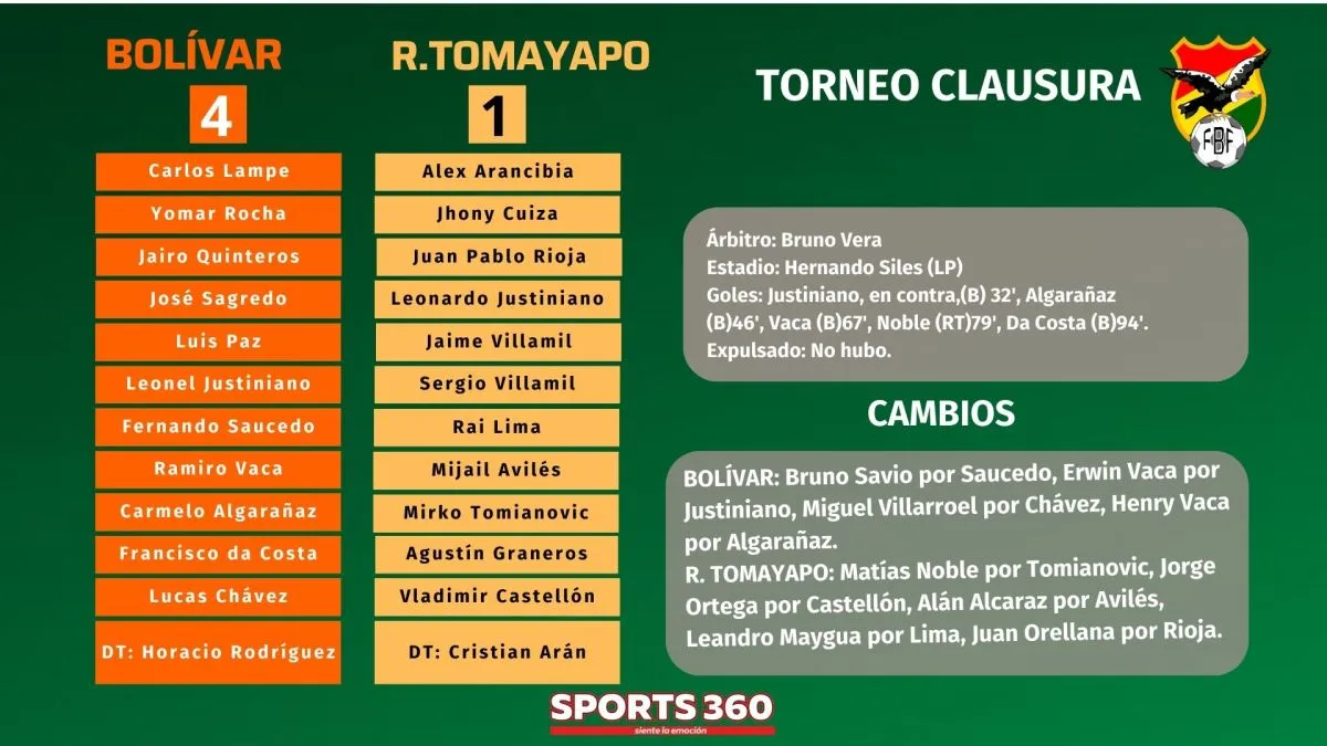 Bolívar mostrando a ratos su fútbol letal con individualidades que desequilibraron en el momento justo, venció esta noche a Real Tomayapo por 4-1, consiguiendo su segundo triunfo al hilo y confirmándose en el liderato del torneo Clausura.