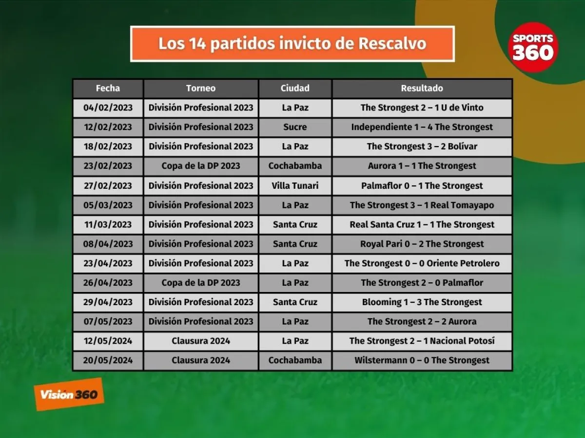 El técnico español Ismael Rescalvo elevó a 14 partidos su invicto dirigiendo a The Strongest en torneos locales, después del empate del domingo por la noche con Wilstermann (0-0) en Cochabamba, por la segunda fecha del torneo Clausura 2024.