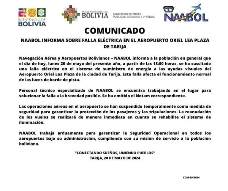 Debido a una falla eléctrica que afecta las luces de borde de pista, Navegación Aérea y Aeropuertos Bolivianos (Naabol) suspendió este lunes las operaciones en el aeropuerto Oriel Lea Plaza de Tarija.