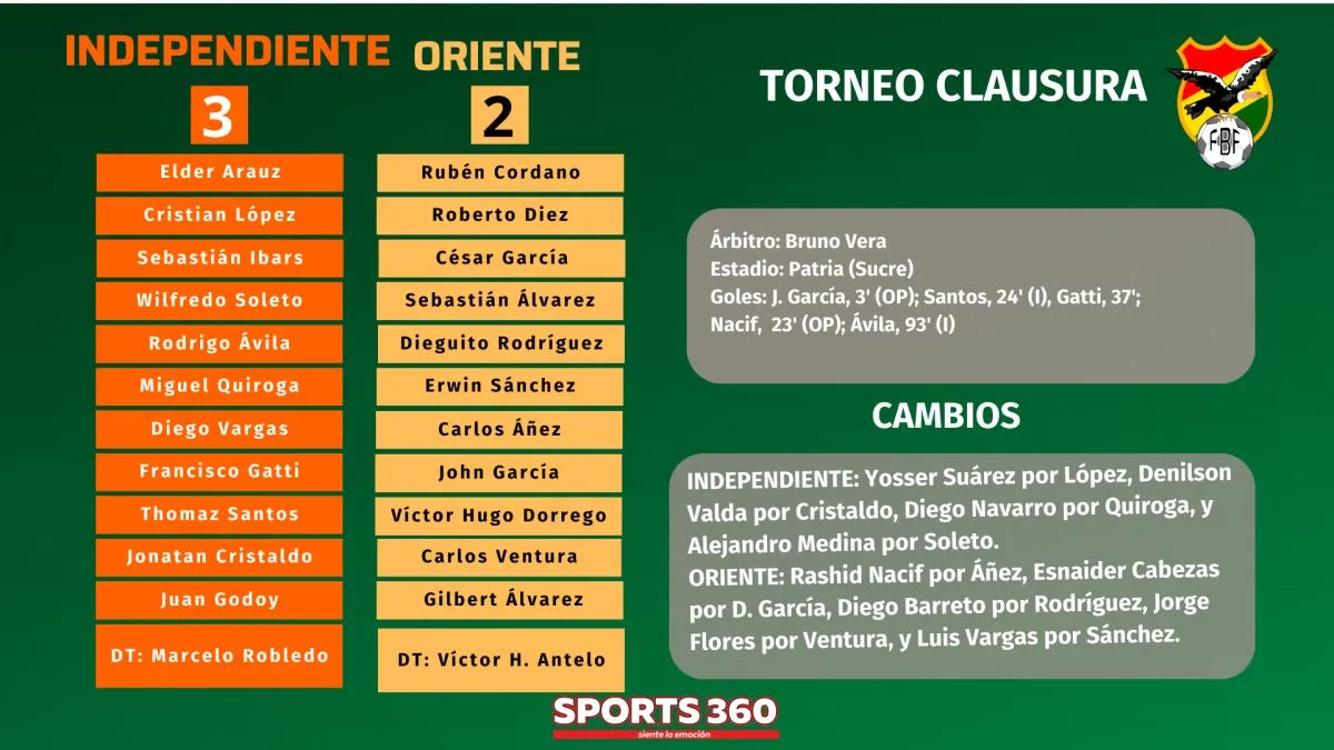 Independiente tuvo que extremar recursos para conseguir primera victoria en el Torneo Clausura de la División Profesional al derrotar 3-2 a Oriente Petrolero, este martes en el estadio Patria de Sucre, en el inicio de la segunda jornada del Torneo Clausura de la División Profesional.