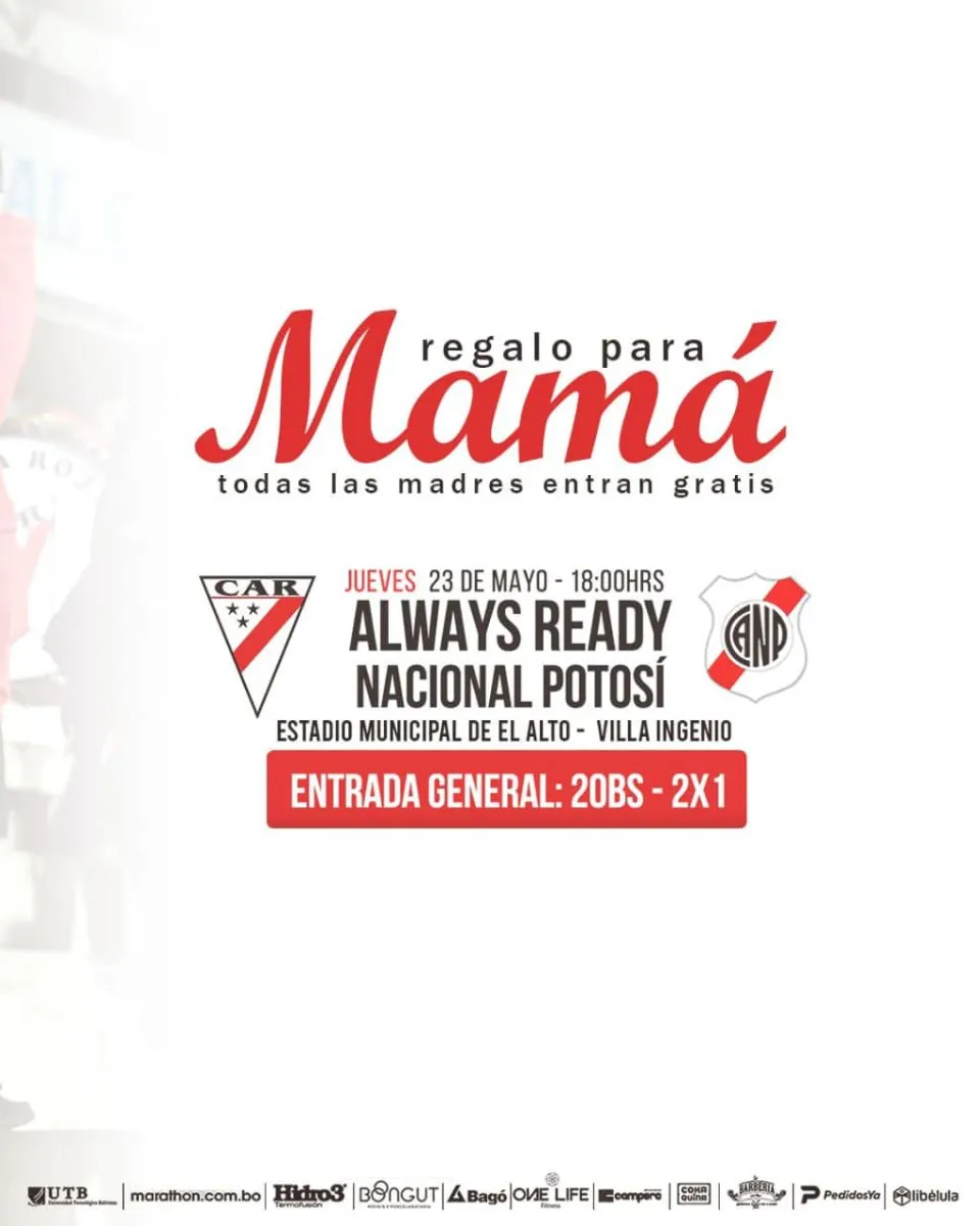 Además, la dirigencia del club albirrojo, ha tomado la decisión de que las damas que son madres de familia, ingresarán gratis para ver a Always Ready, como un homenaje del club al día de la madre que será el venidero 27 de mayo.