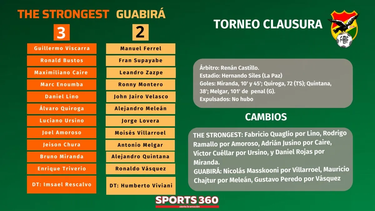 The Strongest derrotó a Guabirá 3-2 este jueves en el estadio Hernando Siles, por la tercera jornada del Torneo Clausura de la División Profesional, en un partido en el que el marcador estrecho no refleja lo que sucedió en el juego