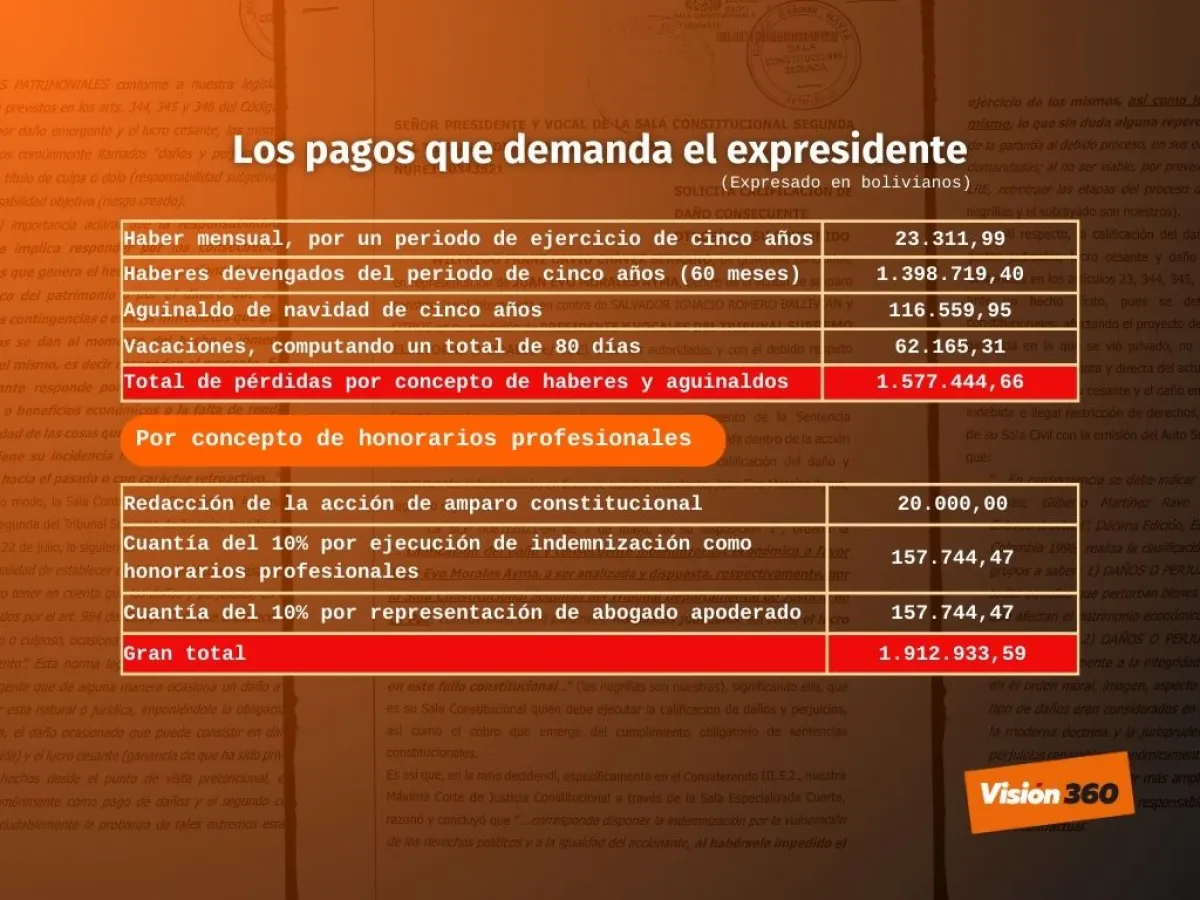 “Por lo expuesto, solicitamos respetuosamente se proceda a la calificación y consecuente indemnización económica a favor de Juan Evo Morales Ayma, por un total de Bs. 1.912.933,59”, concluye.