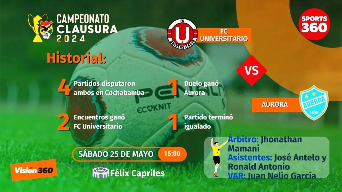 El choque enre Universitario de Vinto y Aurora abrirán la cuarta fecha del torneo Clausura de la División Profesional, en partido que se disputará desde las 15.00 en el estadio de Quillacollo. Los dos equipos vallunos intentarán terminar entre los tres primeros del certamen, antes del receso obligado por la disputa de la fecha FIFA y la participación de la Selección en la Copa América.
