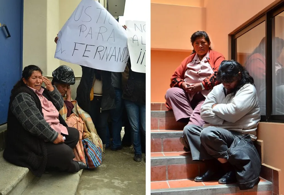 Norma Sumi, a izquierda, en 2014 frente al penal de San Pedro. A la derecha, en las gradas del tribunal donde se realizaba el juicio contra su hijo. Foto: Carlos Quisebert