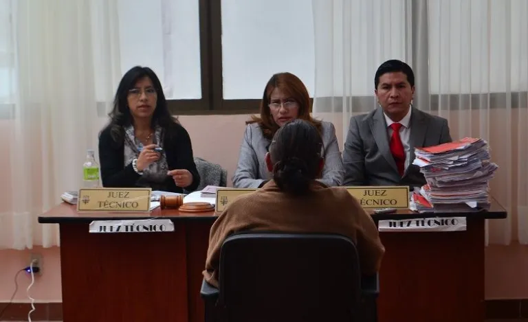 Los jueces, Galdis Guerrero, Patricia Pacajes y Roberto Mérida interrogan a la enfermera Lola Rodríguez. Foto: Carlos Quisbert