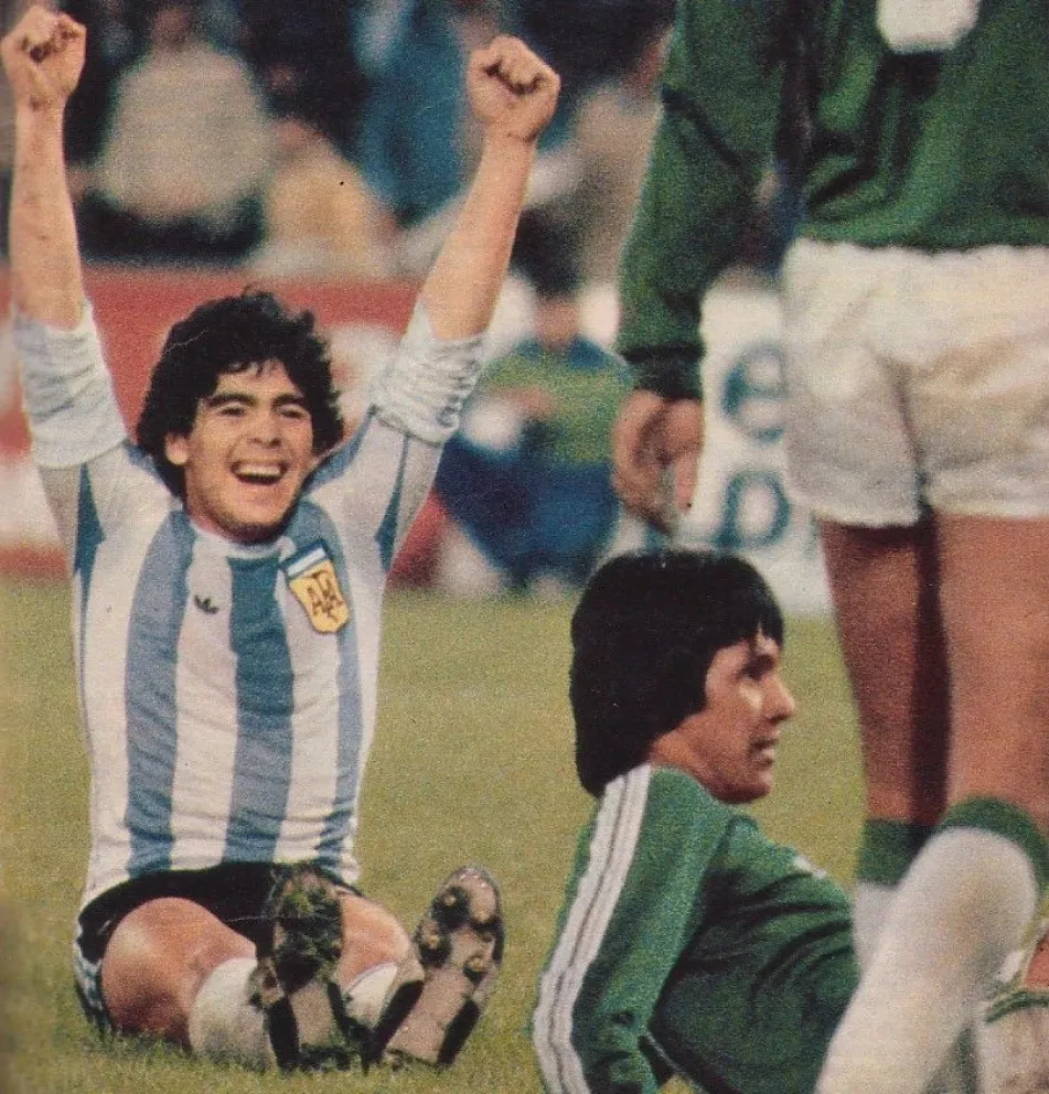 Maradona celebra su gol frente a Bolivia (1979), en el piso quedó Pablo Baldivieso. Foto: HFB