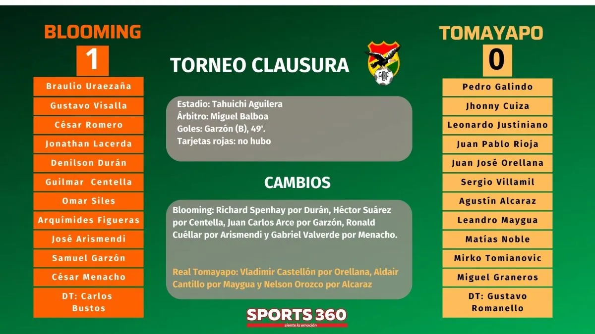 Blooming consiguió su tercer triunfo al hilo en el torneo Clausura gracias a un sufrido triunfo ante Real Tomayapo de Tarija, partido de la cuarta jornada, que se jugó en la noche de este sábado en el estadio Tahuichi Aguilera.