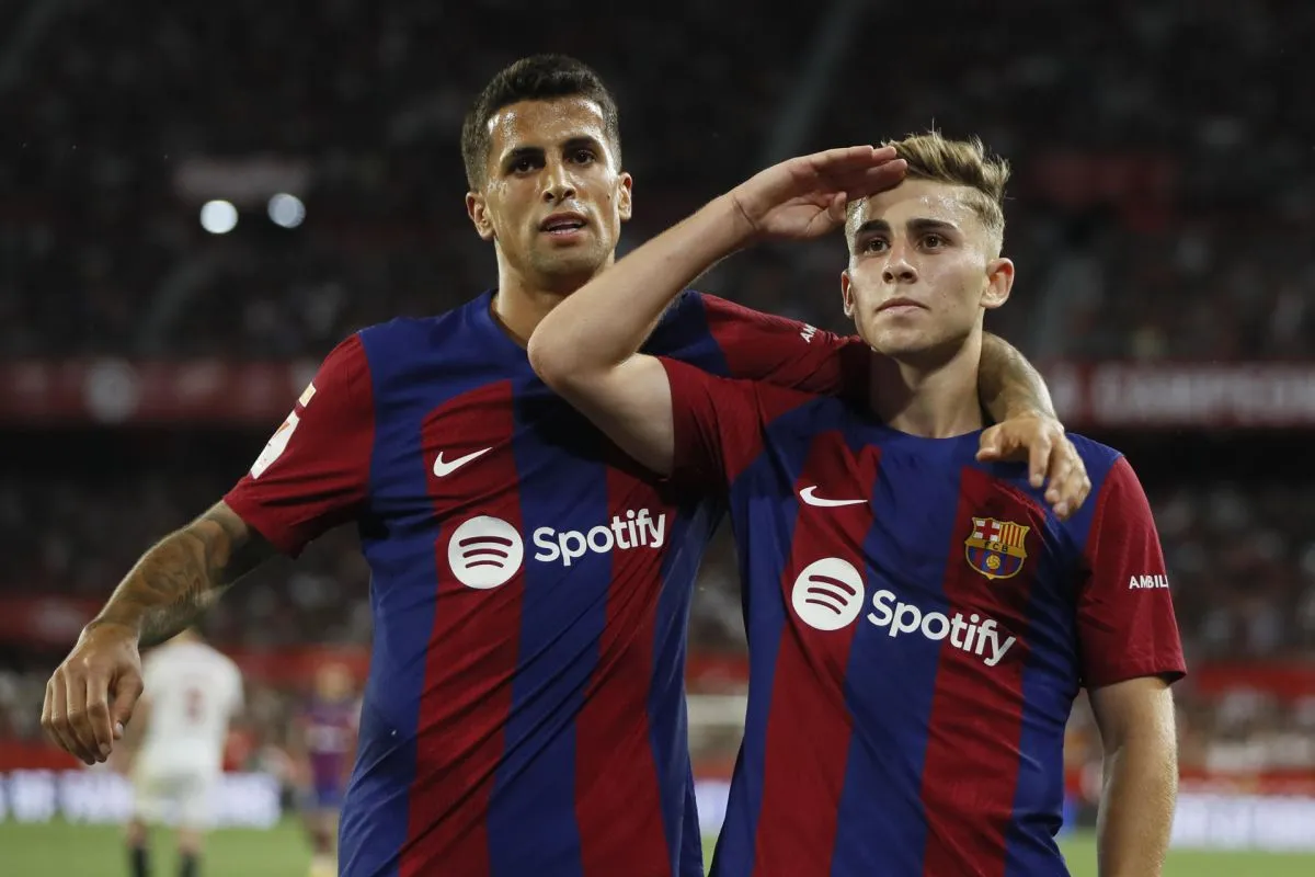 Fermín López (der.), junto a su compañero Cancelo, festeja el segundo gol del Barcelona. Foto: EFE