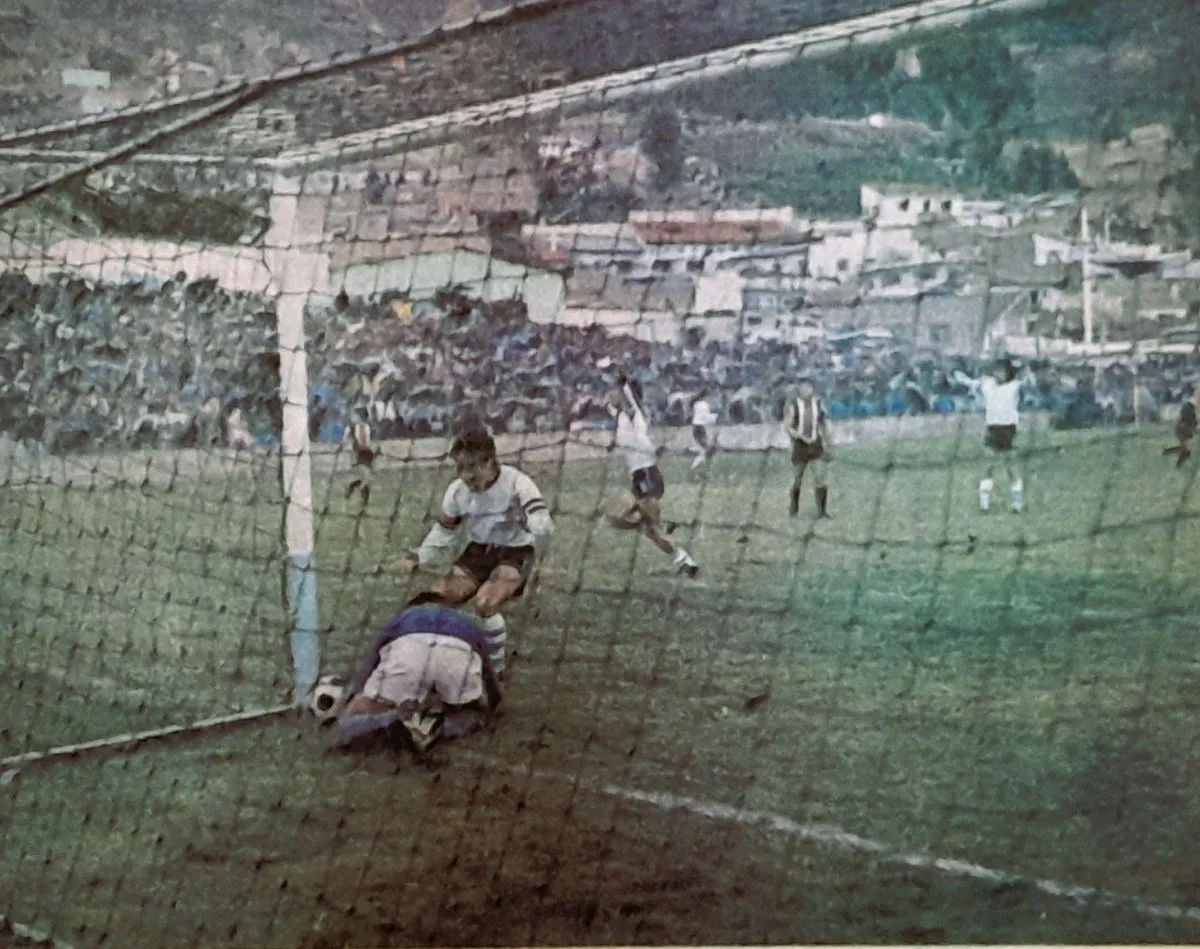 El segundo gol de los celestes en el arco sur del viejo estadio de Tembladerani. Foto: Hemeroteca UMSA