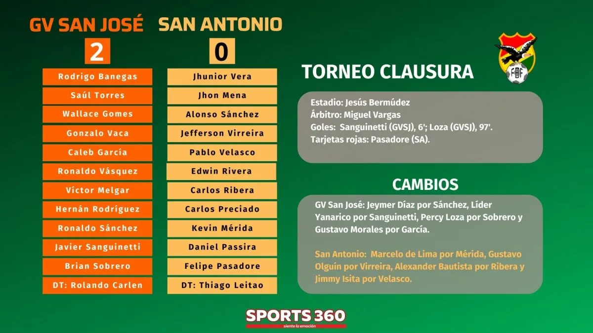 GV San José obtuvo su primer triunfo en el torneo Clausura de la División Profesional al vencer por 2 a 0 a San Antonio de Bulo Bulo, el campeón del torneo Apertura, en partido de la cuarta jornada del Clausura, que se jugó en la tarde noche de este lunes en el estadio Jesús Bermúdez de Oruro.