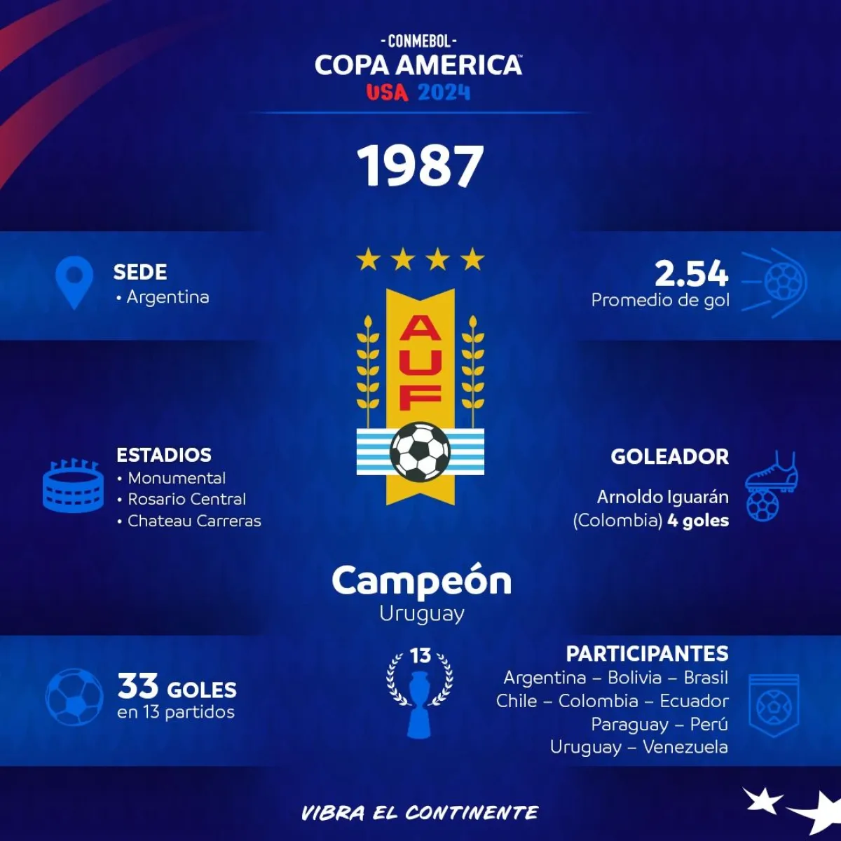 En la  Copa América de 1987 el torneo volvió a su estructura original de un solo país como sede de la competencia, con la participación de las diez selecciones pertenecientes de la Conmebol, divididas en tres grupos de tres equipos y con el campeón anterior clasificado directo para las Semifinales, Uruguay.