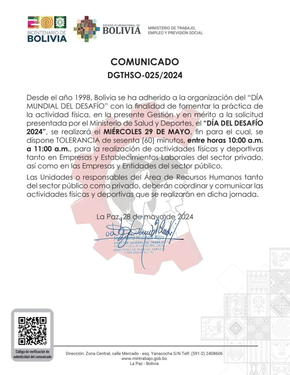 Entre las 10.00 y las 11.00 de este miércoles, los trabajadores del sector público y privado tendrán tolerancia para realizar actividades físicas y deportivas, en el marco del Día del Desafío, según confirmó el Ministerio de Trabajo.