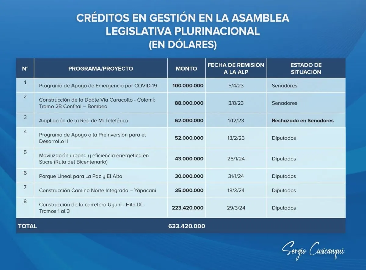 El ministro de Planificación del Desarrollo, Sergio Cusicanqui, anunció este miércoles que el Gobierno envió a la Asamblea Legislativa Plurinacional (ALP) tres nuevos proyectos de ley de financiamiento externo, cuyo monto sumado asciende a 290 millones de dólares, con lo que ya suman 920 millones en proyectos de préstamos que deben ser tratados por esa instancia legislativa.