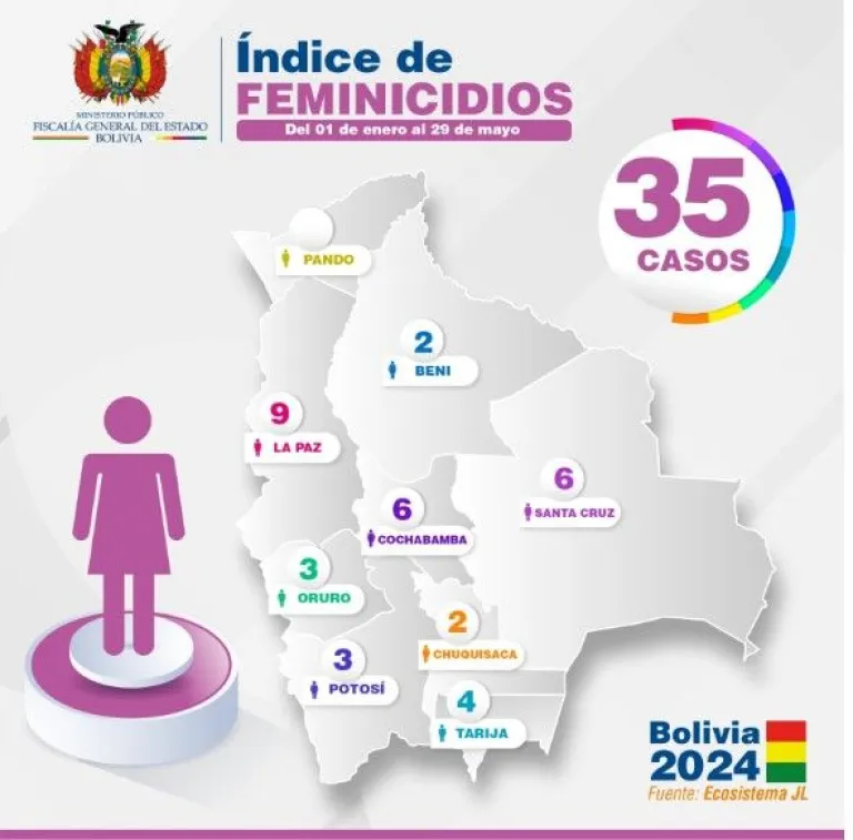 El año pasado, en el mismo periodo de tiempo, el país reportó 38 feminicidios. Mientras que en lo que va de este 2024, Bolivia registró 35 mujeres asesinadas, tres casos menos en comparación con el año pasado.