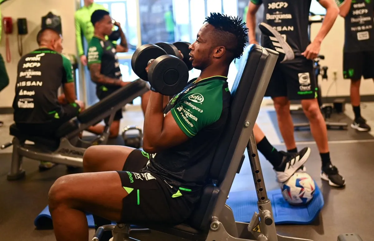 El golero David Akologo levanta unas pesas surante la tarea de gimnasio del jueves en Chicago. Foto: EFE