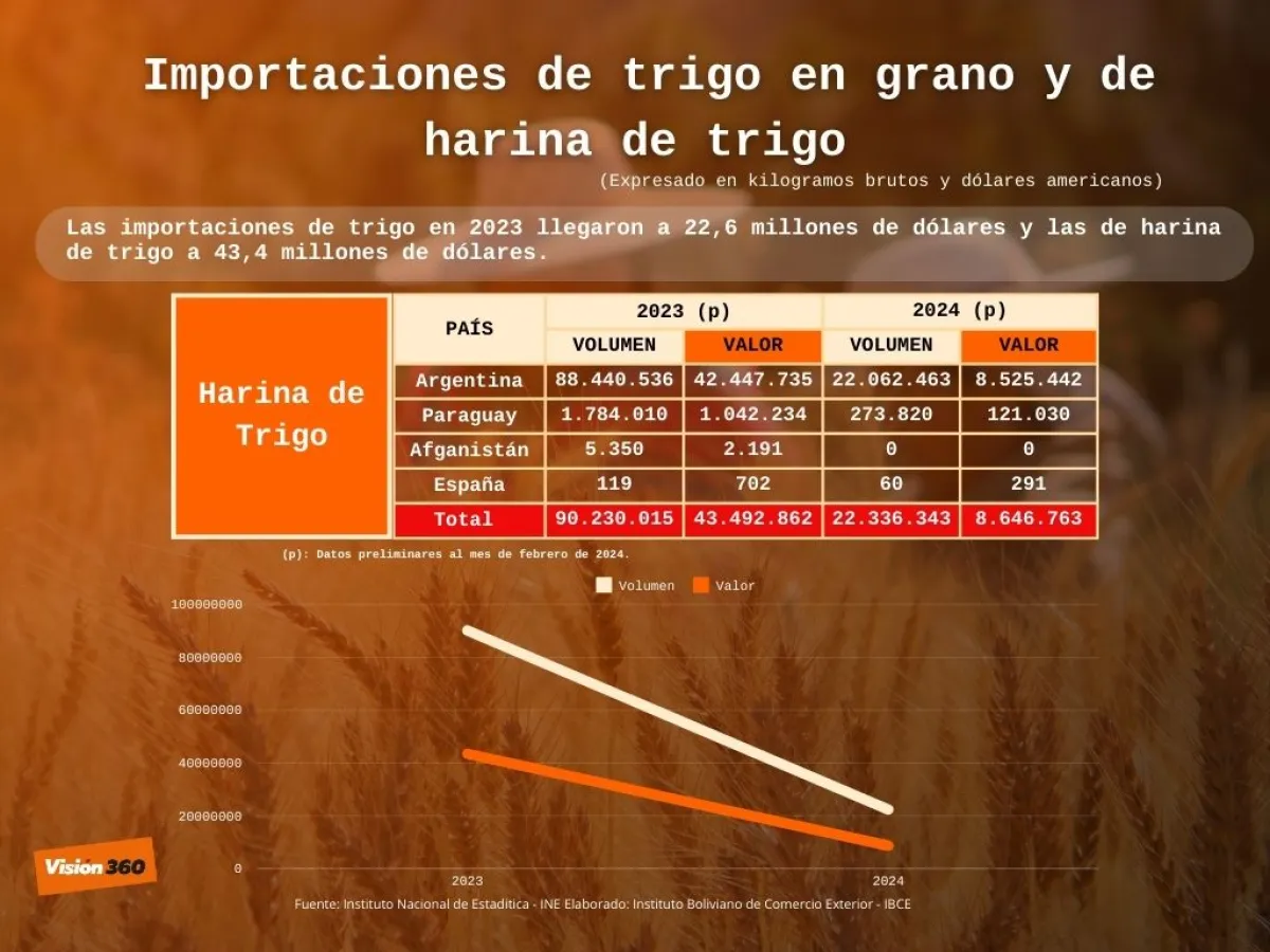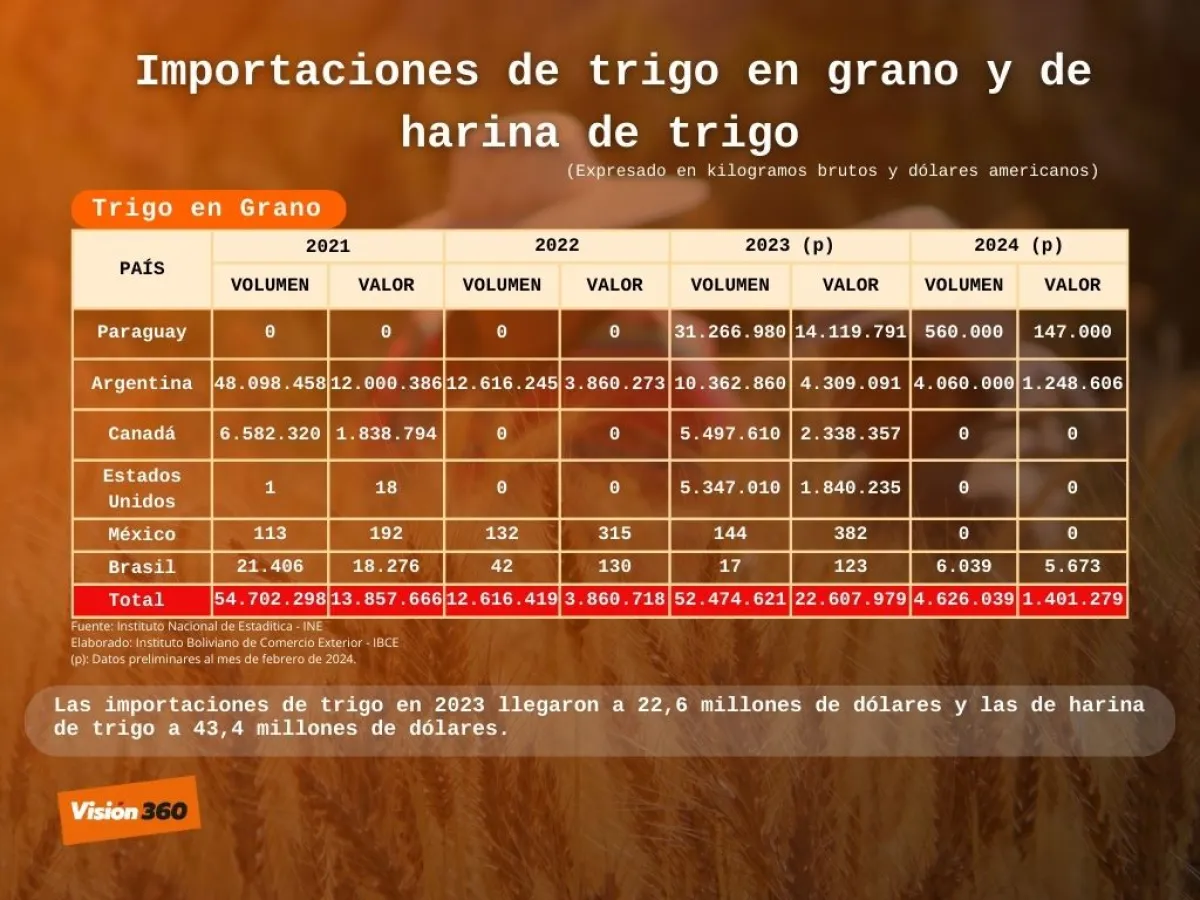 Datos oficiales, procesados por el Instituto Boliviano de Comercio Exterior (IBCE), revelan que las importaciones de trigo en 2021 alcanzaron un valor de 13,8 millones de dólares, al año siguiente 3,8 millones de dólares, en 2023 unos 22,6 millones de dólares y hasta febrero de este año 1,4 millones de dólares.
