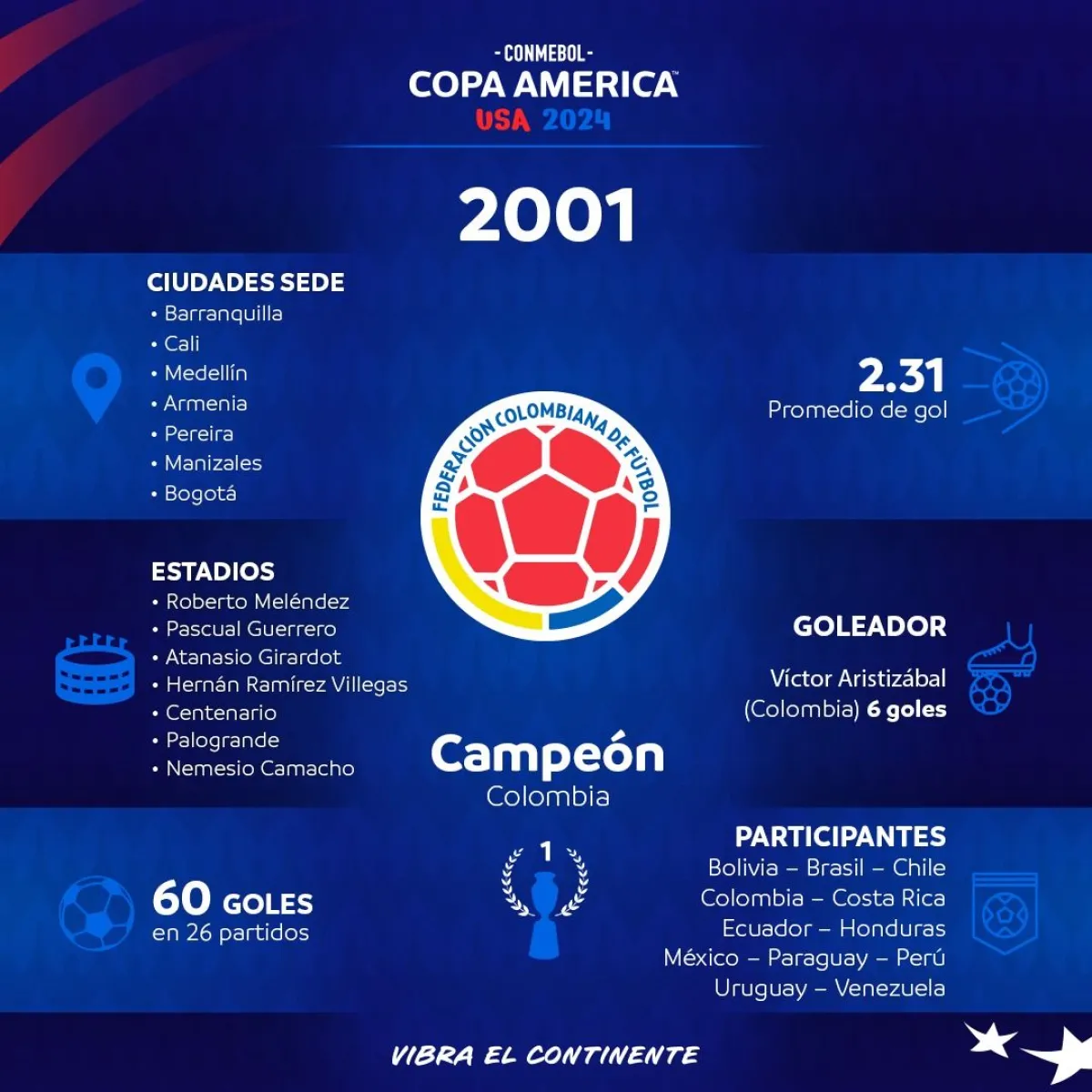Colombia albergó por primera vez la Copa América en la edición que abrió un nuevo mileno en el fútbol sudamericano, que trajo el primer título para los ‘cafeteros’ en la competencia continental, con una campaña que sería histórica y una fiesta inolvidable.