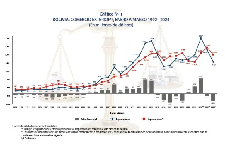 Las exportaciones a marzo de 2024 alcanzaron $us 1.921 millones, cifra menor en $us 724 millones a la que se registró en el mismo período de 2023. Mientras que las importaciones a marzo llegaron a $us 2.359 millones, cifra menor en $us 438 millones a la registrada en igual período de la gestión pasada.