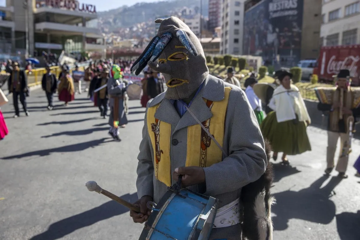 Previamente, un grupo de comunarios de distintas poblaciones marchó por el centro de la ciudad con sus atuendos típicos por algunas comparsas de mujeres y hombres que ondeaban banderas junto a los carismáticos "kusillos", que son una especie de bufones andinos.