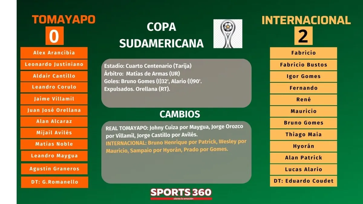 Internacional de Porto Alegre no tuvo problemas para superar esta noche a Real Tomayapo por 3-0, lance jugado en el estadio Cuarto Centenario que le permite ascender en la tabla de posiciones del grupo C donde comparte el segundo lugar con Delfín de Ecuador, ambos con 8 unidades.