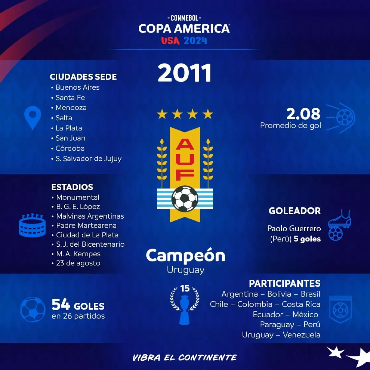Argentina organizó la Copa América por novena vez en el 2011, récord en la competición hasta el día de hoy, con ocho ciudades y estadios distribuidos por el país como sede y con el Estadio Monumental de River Plate como escenario de la Final.
