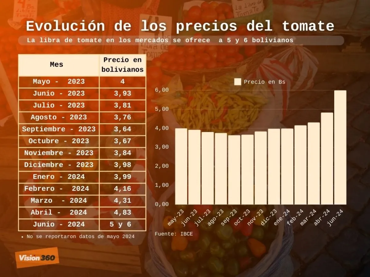 Desde el Viceministerio de Defensa al Consumidor se admitió que hay una subida en el precio del tomate en el país. Atribuyen el incremento a que en esta época no se siembra en Bolivia y el producto que llega importado es más caro.