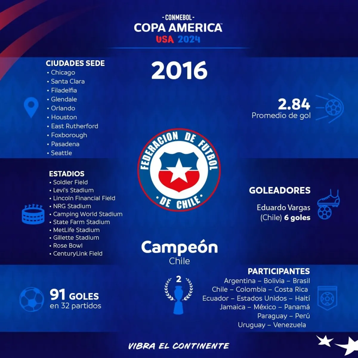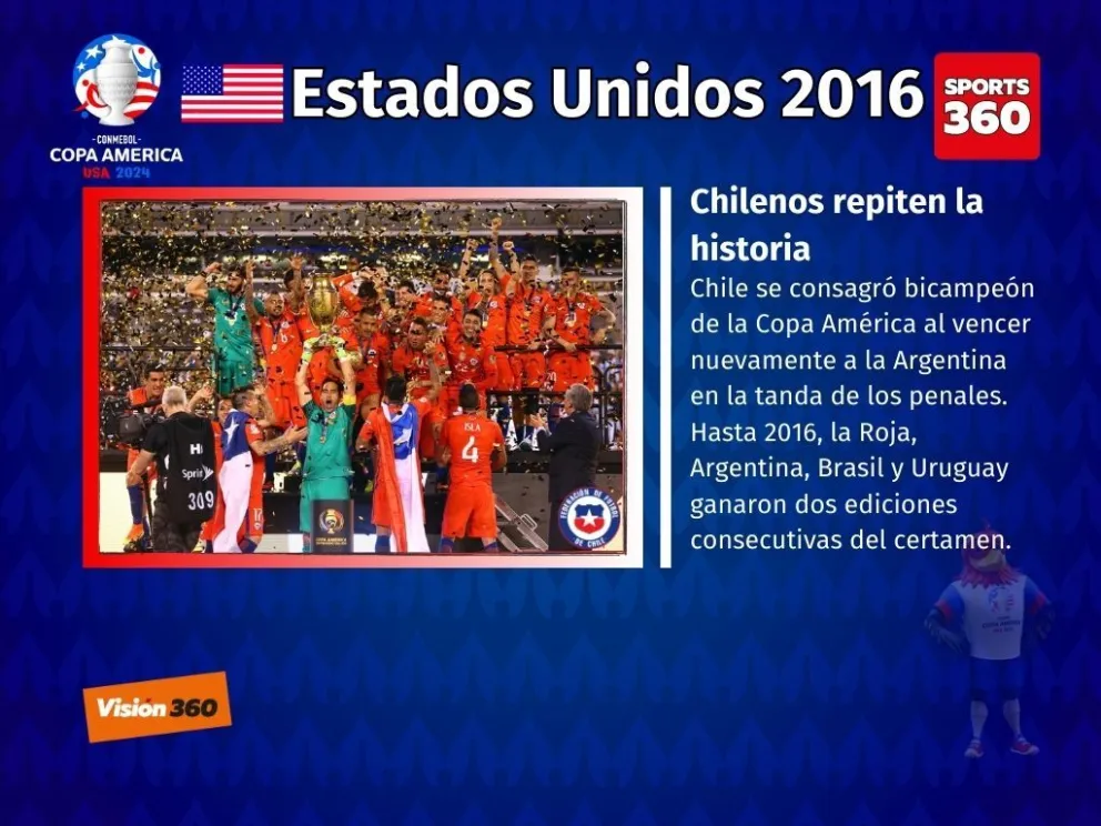 Chile conquistó su segunda Copa América en la edición del 2016, un año después de haberse consagrado por primera vez en su historia en el torneo que recibió como anfitrión.