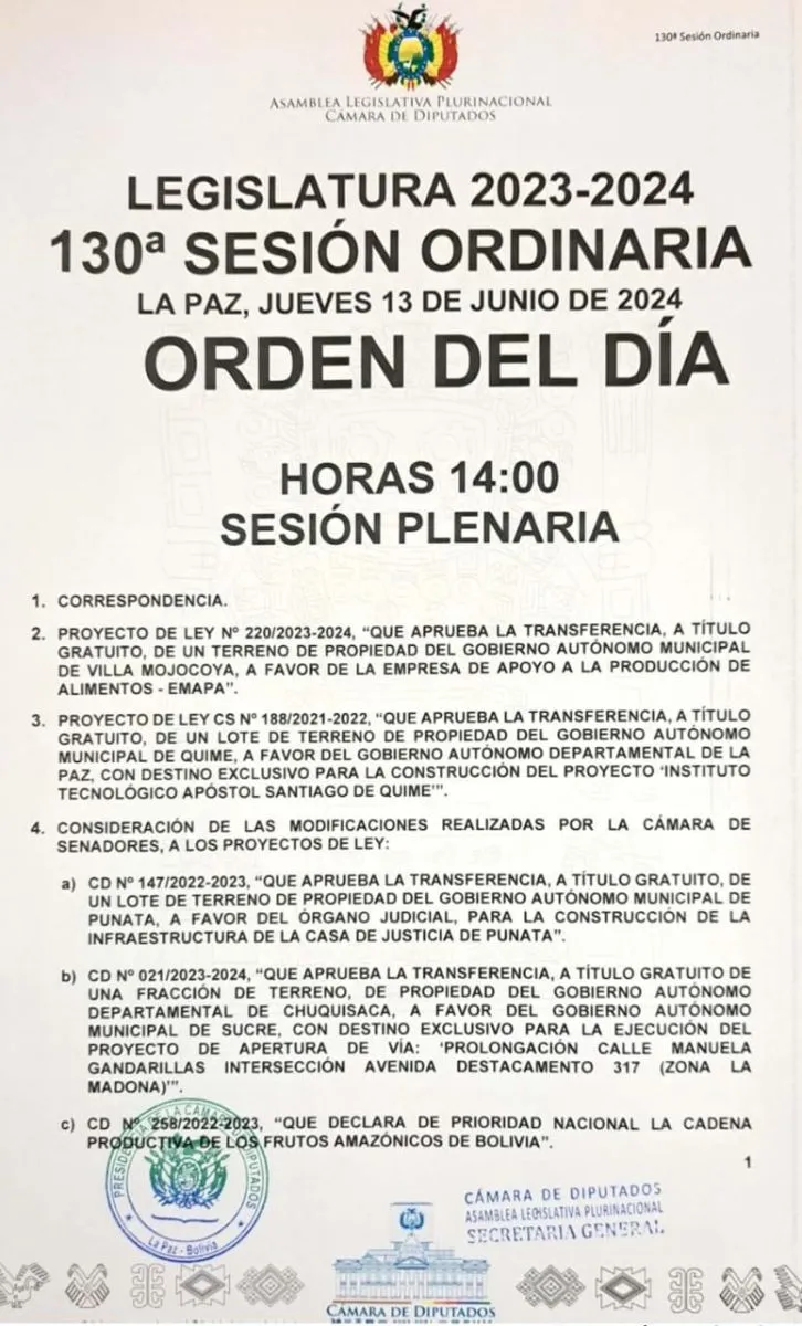El presidente de la Cámara de Diputados, Israel Huaytari, informó este miércoles que al menos cuatro proyectos de ley “de prioridad para el país” serán tratados en la siguiente sesión de la Cámara Baja, programada para esta semana.