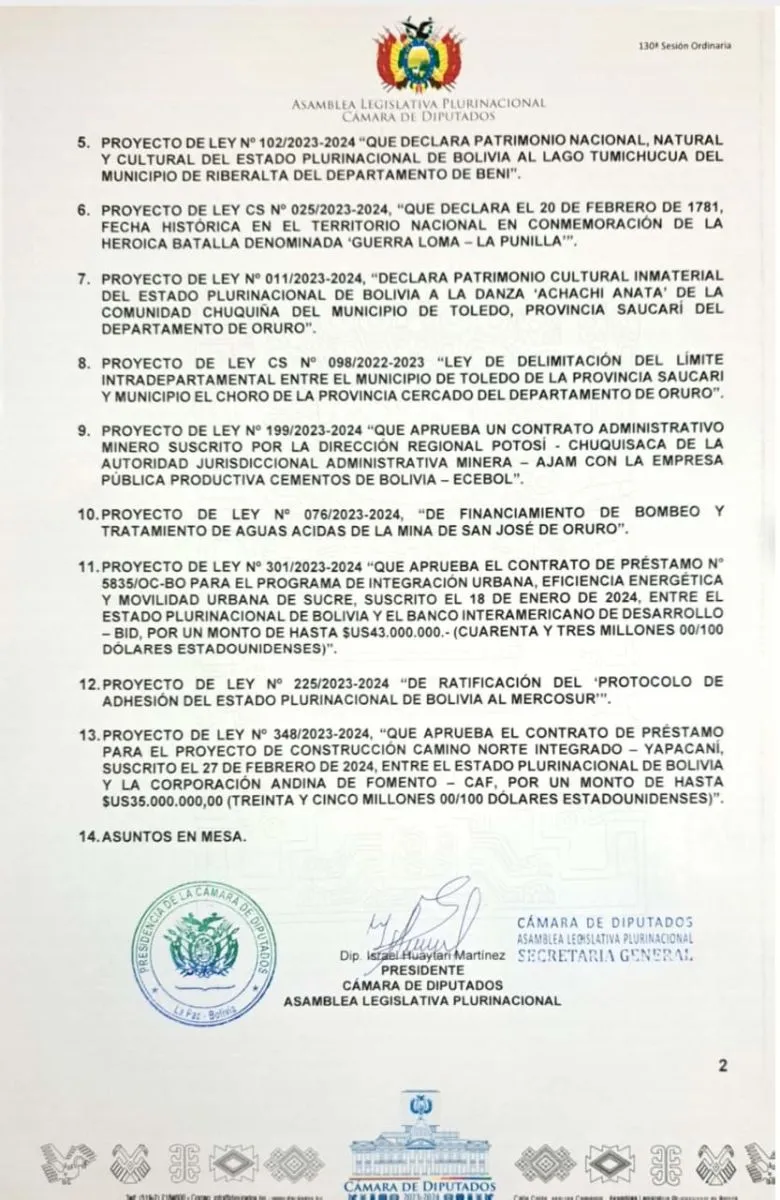 En la agenda también está el proyecto de ley de contrato de préstamo con la CAF (Corporación Andina de Fomento), para el camino asfaltado Uyuni – Hito 60, con una inversión de 240 millones de dólares.