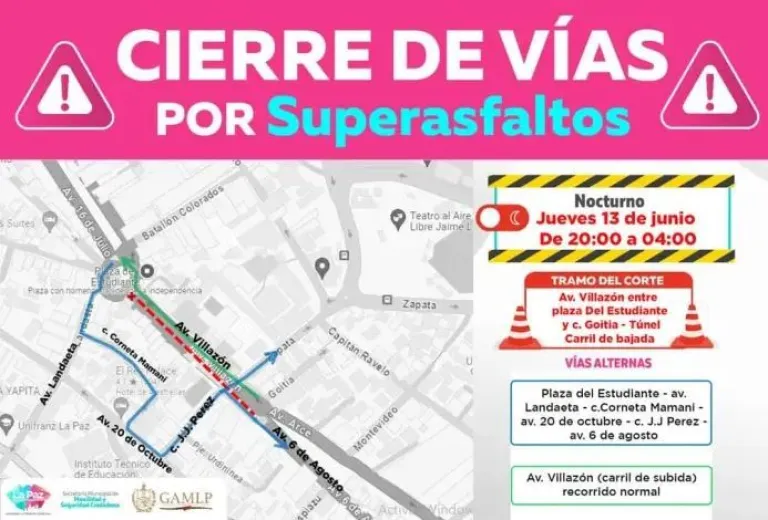 La Alcaldía de La Paz anunció para este jueves el cierre de vías desde las 20:00 hasta las 04:00 de la madrugada de este viernes, debido a trabajos de mantenimiento y mejora de la carpeta asfáltica, conocidos como “superasfaltos”. El tramo intervenido será la avenida Villazón, desde la plaza del Estudiante hasta la calle Goitia, incluyendo el túnel en el carril de bajada.