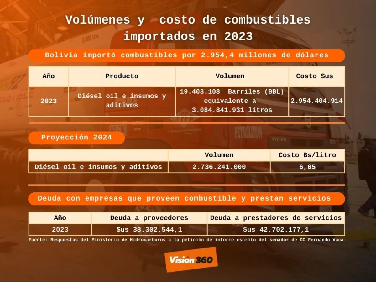 En 2023, Bolivia importó 3.084,8 millones de litros de diésel oil e insumos y aditivos para la gasolina (3.084.841.931 litros) y con un costo CIF de 2.954,4 millones de dólares ($us 2.954.404.914), es decir sin contar con gastos de transporte, logística, según datos oficiales.