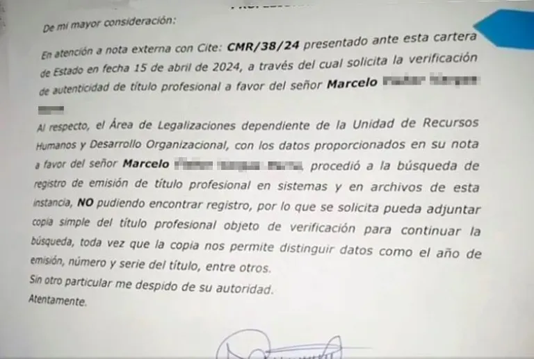 La Udabol, por su parte, certificó que “no emitió ningún título académico" en favor de Marcelo F. V.