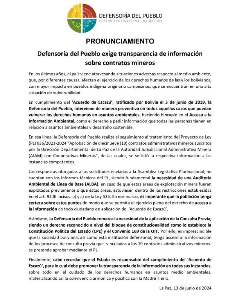 “Por ello, es imprescindible que la sociedad boliviana, así como esta institución defensorial, tenga acceso a la información de los procesos de consulta previa que vinculados a los 19 contratos administrativos mineros se pretende aprobar mediante el proyecto de ley”, dijo la entidad en su pronunciamiento, con fecha 13 de junio.