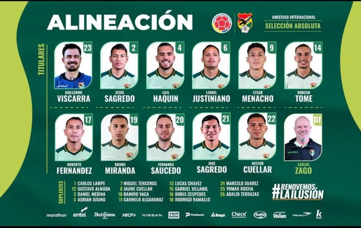 Antonio Zago, el seleccionador nacional, realiza ocho cambios en la formación de Bolivia para el partido de este sábado (17.00) en Connecticut contra Colombia, respecto al equipo inicial que presentó hace unos días contra Ecuador.