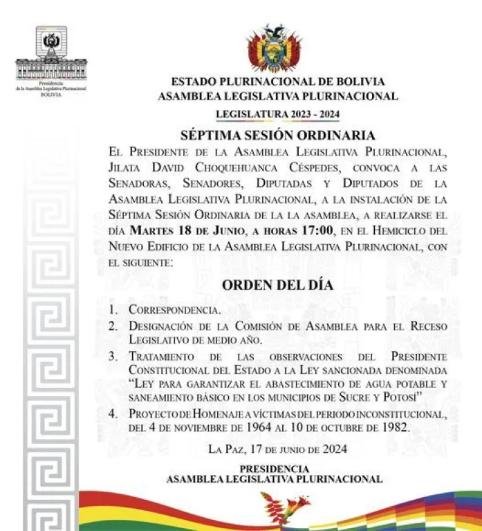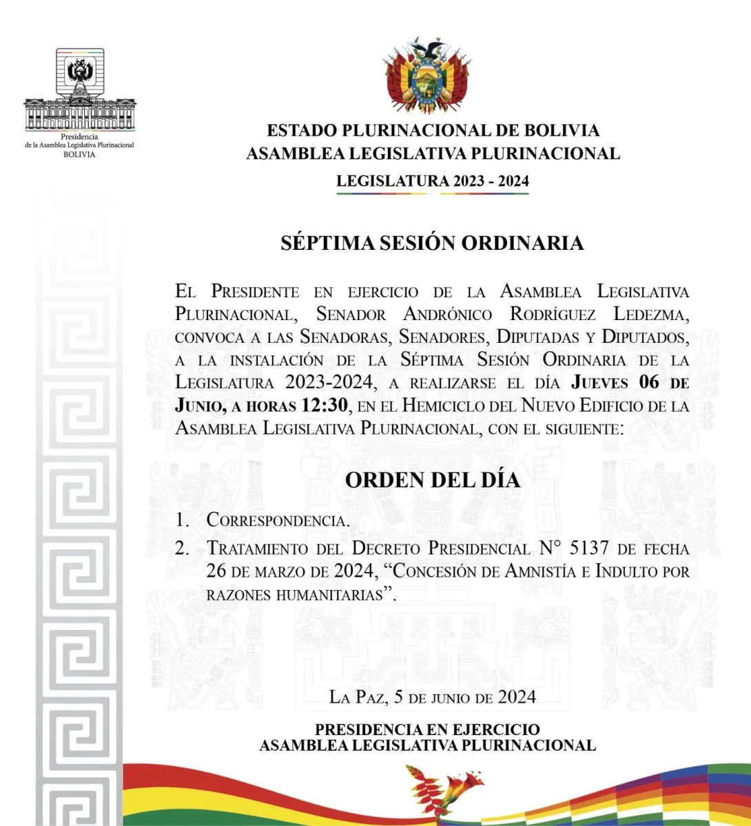 Con esa convocatoria, Choquehuanca estaría desconociendo la sesión de la ALP celebrada el pasado 6 de junio cuya agenda era Correspondencia y Tratamiento del Decreto Presidencial 5137 de fecha 26 de marzo de 2024 “Concesión de Amnistía e Indulto por razones humanitarias”.