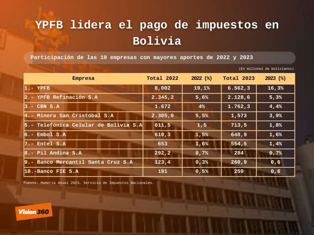 YPFB contribuyó con 6.562,3 millones de bolivianos en 2023 y pese a que bajó su aporte de 2022, que fue de 8.002 millones de bolivianos, se mantiene como la principal empresa del país y la que más impuestos paga.