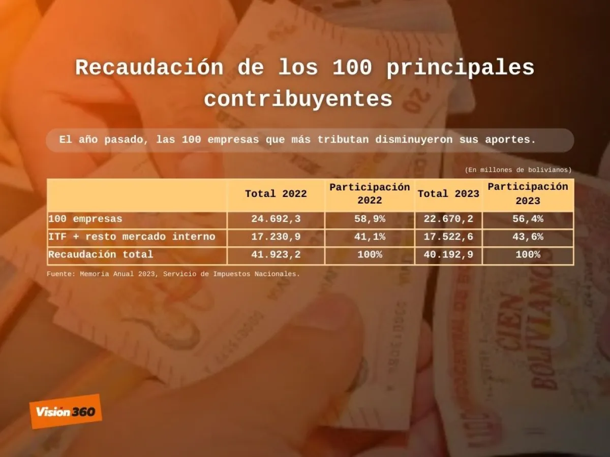 Bajó la recaudación de impuestos de las 100 mayores empresas que, en conjunto, pagaron Bs 22.670,2 millones de bolivianos, monto inferior en más de 2 mil millones, respecto a 2022.