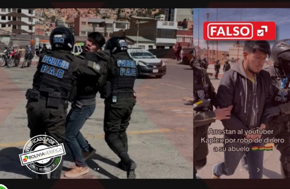 Con dos fotografías publicadas en TikTok, se asegura que el creador de contenidos Jhamil Kaleb Marca o conocido como Kapléx fue arrestado por robar el dinero a su abuelo y con eso irse de viaje. Pero este contexto es falso porque las imágenes fueron tomadas de un sketch que grabó el tiktoker orureño.