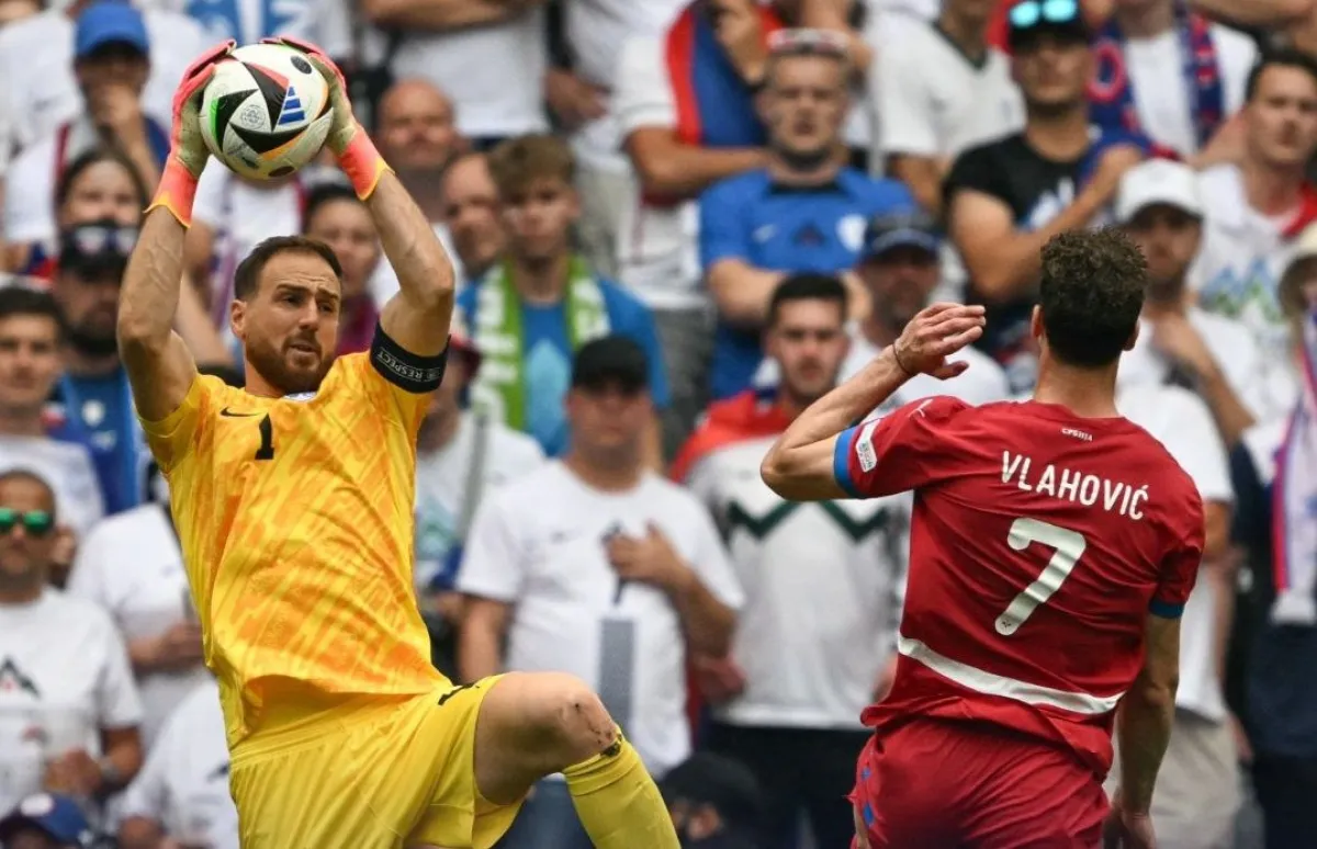El guardameta esloveno Oblak contiene la pelota ante el ataque de Vlahovic. Foto: UEFA Eurocopa.