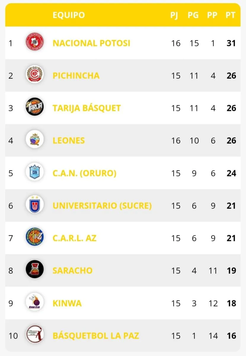 Tarija Básquet, el potosino Leones y el orureño CAN aseguraron su pase a los Play-Offs cuartos de final de la Liga Boliviana de Básquetbol (Libobásquet) masculina tras la decimoquinta jornada, que estuvo marcada por la primera derrota de Nacional Potosí en lo que va del torneo frente a CAN (51-83).