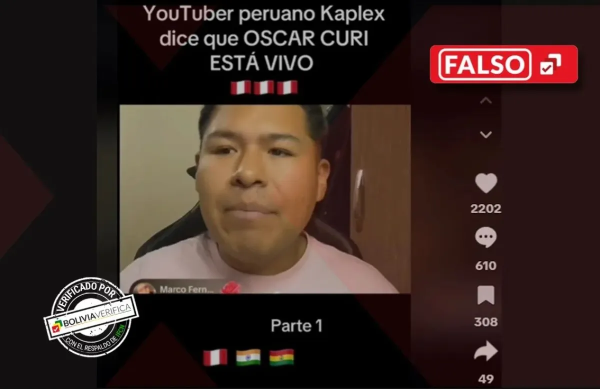 “Jugo de maní” es una cuenta de Tik Tok donde el pasado 11 de junio se subió un video del youtuber orureño, Kapléx, hablando sobre su colega, el creador de contenidos, Óscar Curi, de nacionalidad peruana. Sin embargo, el video titula “Youtuber peruano Kaplex dice que Óscar Curi está vivo”, lo que generó confusión en los seguidores de la cuenta.