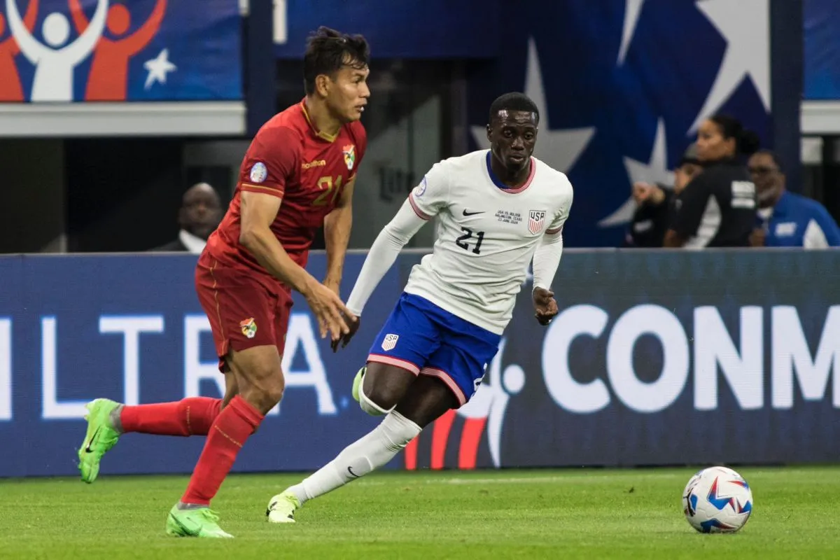 Haquín, el mejor de Bolivia, corta una jugada del mediocampista Pulisic. Foto: FBF
