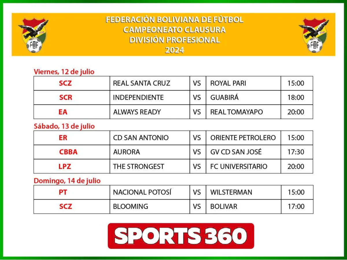 Para el sábado se han programado los cotejos: San Antonio vs. Oriente Petrolero (15.00), Aurora vs. GV San José (17.30) y The Strongest vs. FC Universitario (20.00).