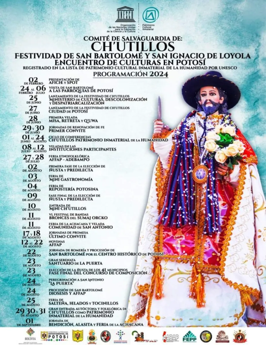“Esta es una actividad muy importante, la festividad de Ch’utillos San Bartolomé, San Ignacio de Loyola es un encuentro de culturas del municipio de Potosí y del departamento, con diferentes actividades durante todo el mes de agosto, que concluirá con una gran entrada autóctona y folklórica”, dijo la ministra Guevara.