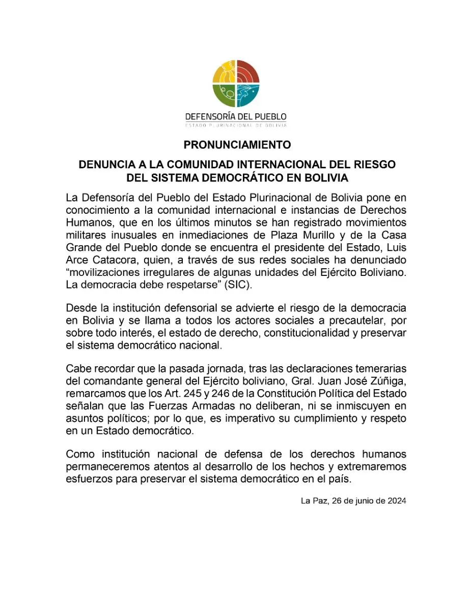 “La Defensoría del Pueblo del Estado Plurinacional de Bolivia pone en conocimiento a la comunidad internacional e instancias de Derechos Humanos, que en los últimos minutos se han registrado movimientos militares inusuales en inmediaciones de Plaza Murillo y de la Casa Grande del Pueblo donde se encuentra el presidente del Estado, Luis Arce Catacora, quien, a través de sus redes sociales ha denunciado ‘movilizaciones irregulares de algunas unidades del Ejército Boliviano. La democracia debe respetarse’ (SIC)”, inicia el comunicado.
