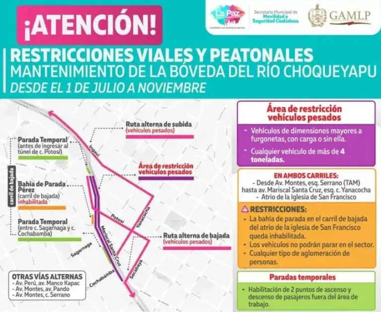 La Alcaldía de La Paz publicó este viernes las restricciones vehiculares y peatonales que se aplicarán en San Francisco a partir del próximo lunes 1 de julio, por los trabajos de restauración y reconstrucción de la bóveda del río Choqueyapu.